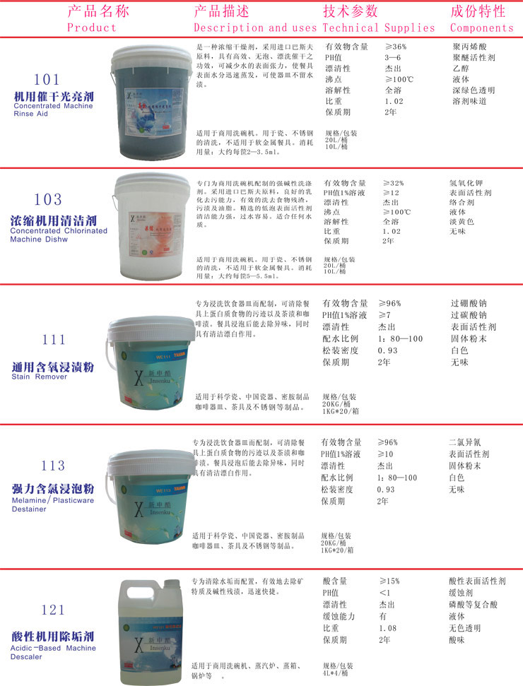 | WE101 機(jī)用催干光亮劑 | WE103 濃縮機(jī)用洗滌劑 | WE121 酸性機(jī)用除垢劑 |